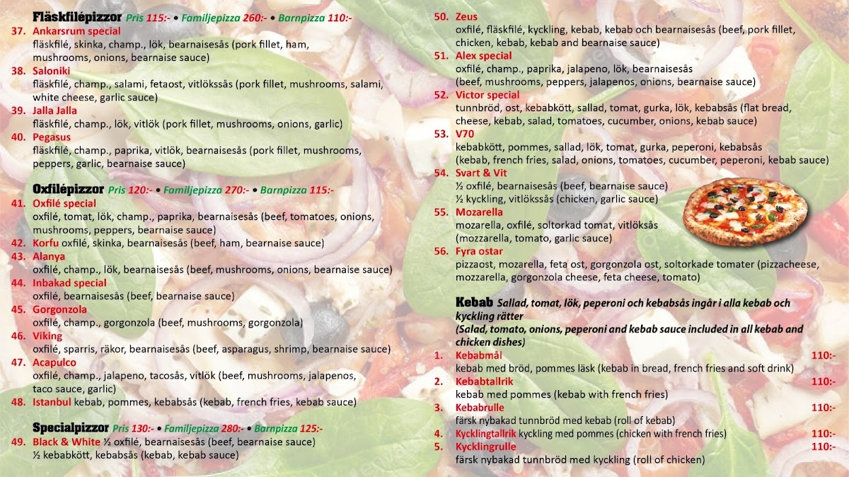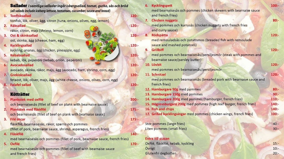 The menu at Restaurang Mikonos offers a delightful variety of classic dishes, each packed with flavors that satisfy a range of tastes. For meat lovers, the Plankstek is a standout, a juicy steak served on a hot plank with a choice of sides, perfect for those seeking a hearty meal. The Kebabtallrik is another crowd favorite, featuring tender kebab meat served with fresh vegetables and a savory sauce. If you're in the mood for something lighter, the Pizza Hawai offers a tropical twist with its generous topping of ham and pineapple, delivering a deliciously sweet and savory combination. For those who enjoy a good burger, the Hamburger is simple yet satisfying, made with a juicy patty and all the classic toppings. Whether you're craving a comforting classic or a familiar favorite, the menu at Mikonos offers something for everyone.